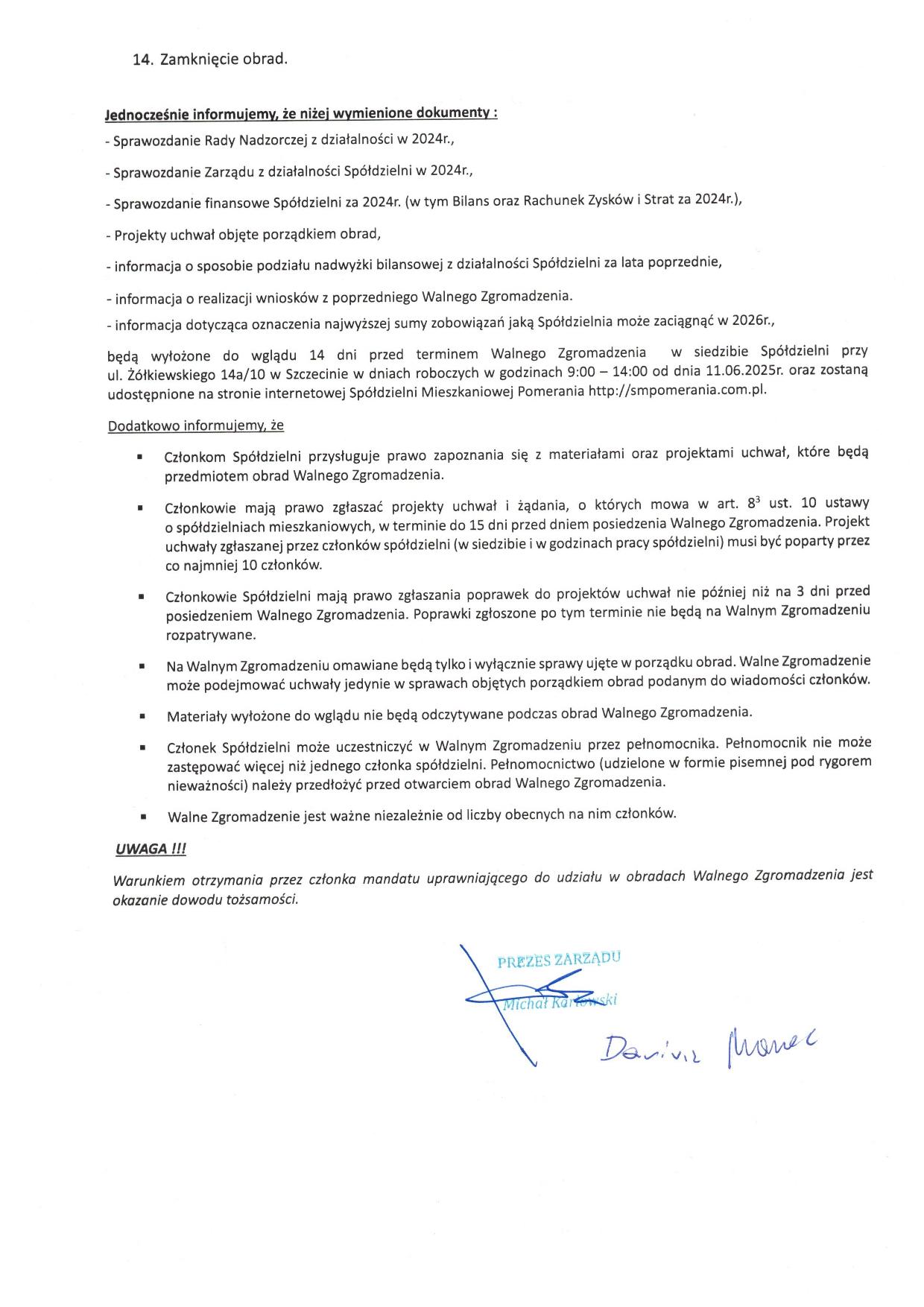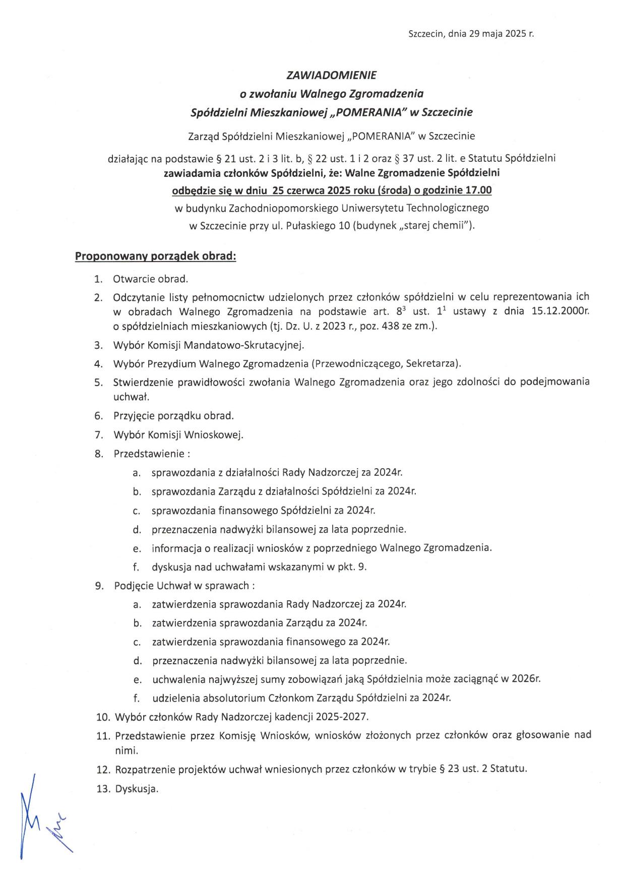 Zarząd Spółdzielni Mieszkaniowej „POMERANIA” działając na podstawie art.8³ ust. 2 i 6 ustawy z dnia 15 grudnia 2000 r. o spółdzielniach mieszkaniowych oraz § 21 ust. 2 i 3b ust. 22 Statutu Spółdzielni zwołuje Walne Zgromadzenie Spółdzielni Mieszkaniowej „POMERANIA” w Szczecinie, które odbędzie się w dniu 27 czerwca 2024 r. o godz. 17.00 w budynku Zachodniopomorskiego Uniwersytetu Technologicznego w Szczecinie przy ul. Puławskiego 10.